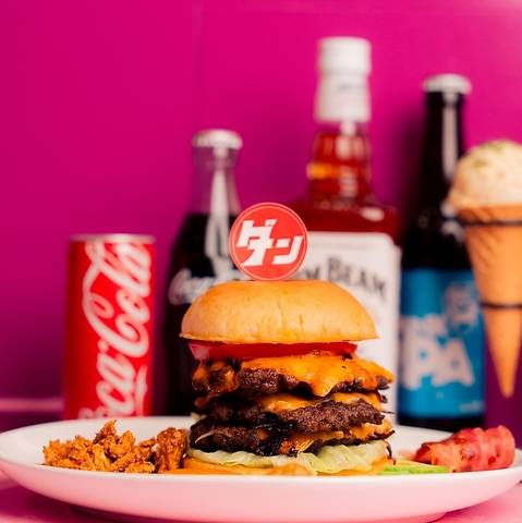ピンクの背景に映えるボリューム満点のハンバーガー。100%ビーフパティととろけるチーズが重なり、見た目にも食欲をそそります。楽しい食事のひとときを!