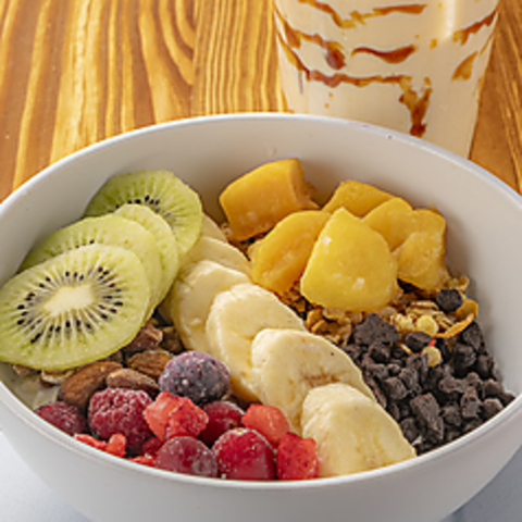 夜のカフェタイムを彩るメニューをご用意しております。たっぷりのフルーツが盛りだくさんのヨーグルトアイス、ドリンク(タピオカorアルコール)がついたセットは心も体も満たされること間違いなし!思わず写真を撮りたくなるフォトジェニックなボウルです!女子会にぴったりなこのフルーツ色とりどりの美しいメニューは、友達との特別なひとときを演出します。