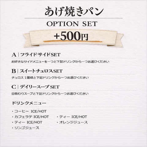 小腹も喉も満たしたい人に!+330円(税込)でドリンクセット+500円(税込)でポテトやチュロス付きのお食事セットにできます。
