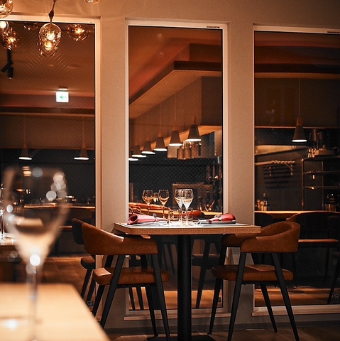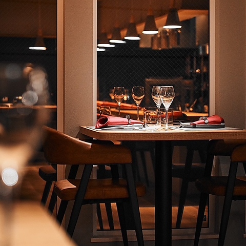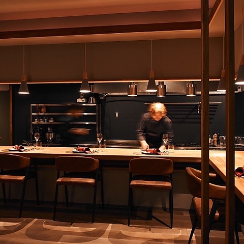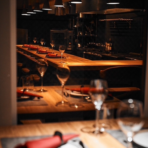 【デートや記念日のお祝いに◎】オープンキッチンのカウンター席では、シェフの技を間近に感じながら、リラックスしたひとときを過ごせます♪2名様掛けのテーブル席もご用意しているため、大切な人と特別な時間を過ごせます♪