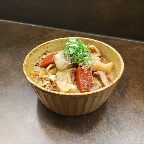 京都西京味噌をたっぷり使用した牛すじこんにゃくは、まろやかで深みのある味わいが自慢です。とろとろに煮込まれた牛スジと弾力のあるこんにゃくが、西京味噌の優しい甘みと絶妙にマッチ。さらに、鮮やかな赤こんにゃくを添え、彩りと食感のアクセントを加えました。伝統の味わいと美しい見た目が楽しめる一品。