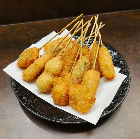 定番メニュー15種類に加え日替わり串まで、多彩な串揚げをリーズナブルにお楽しみいただけます。2種のソースや岩塩・山椒などの調味料でカスタマイズすることも可能。