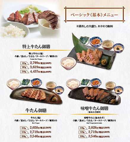 看板商品の熟成特上牛たんをはじめ麦めし・とろろ・テールスープ・小鉢・韓国のりがついたボリューム満点御膳になります。