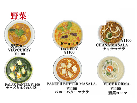 野菜カレー/ダールフライ/チャナマサラ/チーズとほうれん草/バニーバターマサラ/野菜コーマ