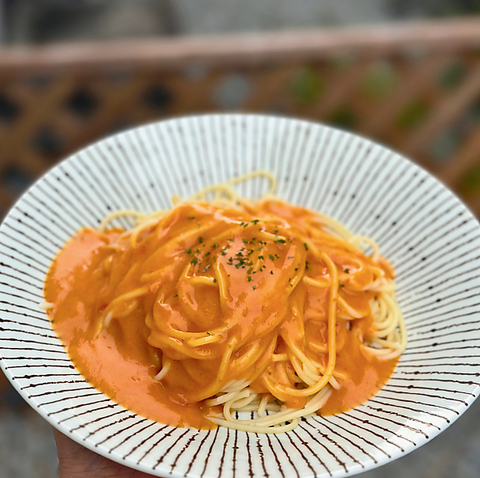 ぷりっとしたイカの食感と、明太子のほどよい塩気がクリームソースに溶け込み、ひと口ごとに奥深い旨みが広がる贅沢パスタ。まろやかなコクの中にピリッとしたアクセントがあり、最後まで飽きずに楽しめる味わいです。濃厚なのに重すぎず、ついフォークが進む一皿に仕上げました。