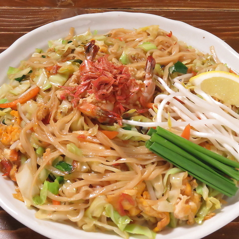 米粉の麺にエビ・もやし・ピーナッツを入れ、ナンプラー等で味付けしたタイの焼きそば