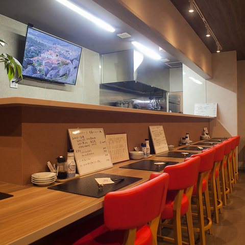 お一人様でも気軽に利用できるカウンター席を8席ご用意。サクッと飲みたい時や、軽く食事を済ませたい時にもぴったりの落ち着いた空間です。目の前で仕上がる料理の香りを感じながら、こだわりの料理とお酒を楽しめる特等席。仕事帰りのちょい飲みはもちろん、気分転換に立ち寄る方にも人気のお席です。