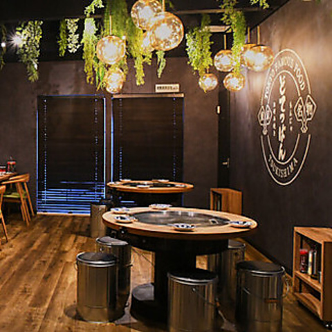 【2F】木の温もりを活かした内装と豊かな緑が特徴です。8名様で使える円卓鉄板もご用意しております。