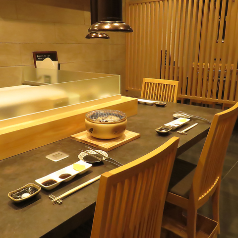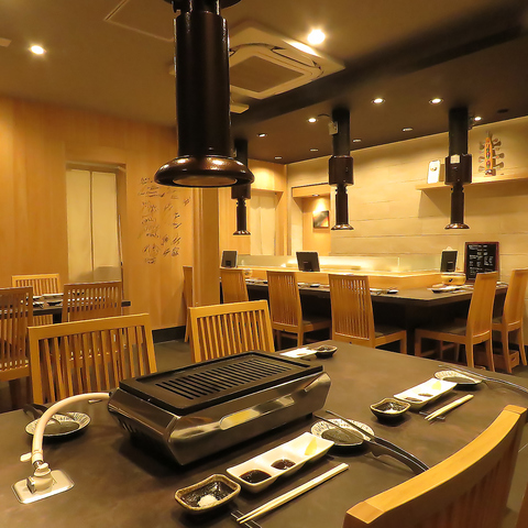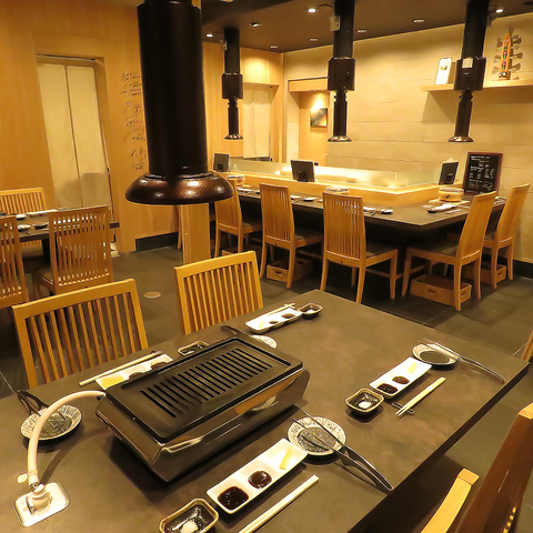 焼肉業界では珍しい「完全無化調」にこだわる当店の料理は、素材本来の繊細な旨味が命です。その味わいを最大限に引き立てるため、内観にもこだわり、落ち着いた照明と和の設えで統一しております。洗練されたテーブル席やライブ感のあるカウンター席など、上質な空間でいただく焼肉コースは格別です。