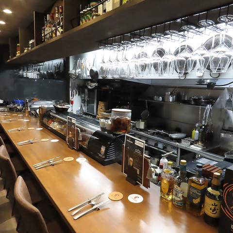 落ち着いた照明が灯るカウンター席は、お一人様やデートに最適です◎炭火の香りを感じる特等席でシニアソムリエ厳選したワインをお客様の食事のペースに合わせてご提案するなど、特別な夜を彩る大人のための空間です♪