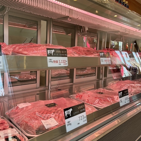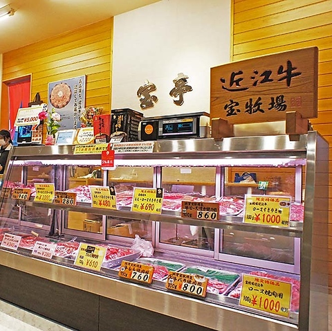 店内で精肉の販売もございます。こだわりの宝近江牛・ミルク豚をお土産や贈り物に、またご家庭で日々の食卓にいかがですか?ぜひお気軽にご利用ください。(営業時間:【土日祝】10:00-19:00【平日】14:00-19:00)