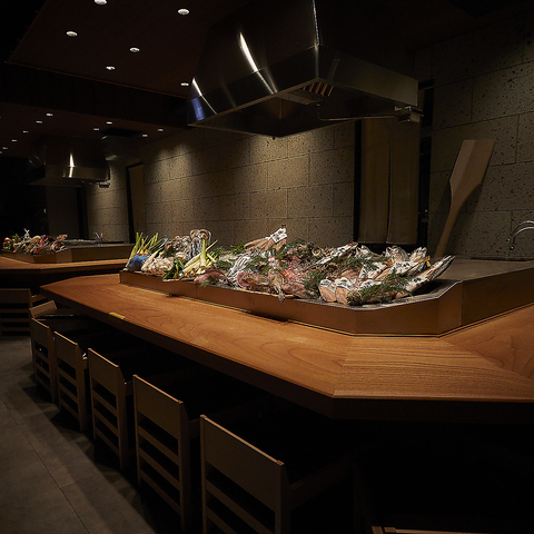 大人酒場空間。木の温もりを基調とした落ち着いた空間に、炭火の香りがふわりと漂います。カウンター席では、職人が魚を返し、煙が立ちのぼるライブ感を間近で楽しめます♪奥にはゆったりと座れるテーブル席が広がり、仲間との飲み会から会社宴会まで幅広く利用できます!
