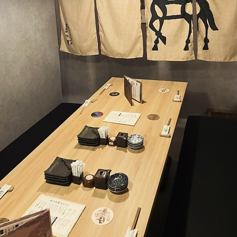 店内は、木を基調とした落ち着いた雰囲気で、日常を忘れてゆったりと寛げる空間です。接待に最適な完全個室や、グループ利用に便利なテーブル席、足を伸ばせる掘りごたつ席、さらに大切な方との語らいの場に最適な掘りごたつ式の個室席もご用意しております。幅広いシーンで、心安らぐひとときをお過ごしいただけますので、ぜひご来店ください。