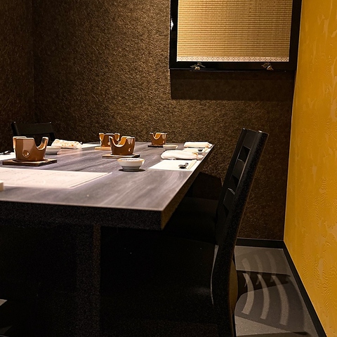 柔らかく落ちる灯りが黒と木の質感を静かに浮かび上がらせる空間、まるで高級旅館の離れに足を踏み入れたかのような澄んだ静けさに満たされています。外の喧騒を忘れさせる穏やかな空気が漂い、大切な席を安心して託せる品格と重みのある佇まい。接待や会食、特別な夜にふさわしい、上質な時間を約束するプライベート空間。