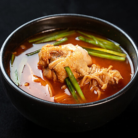 【1】新しく登場した〆もの「チャンタクキンパ」→チャンジャとたくあんの巻き物。【2】アテにも〆にもいい一品「タッケジャンスープ」→手羽元が一本入った食べ応えのある旨辛スープです。【3】「タッケジャンクッパ」→タッケジャンスープを雑炊に。旨辛スープがハマります!