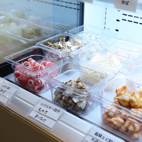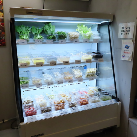 お客様ご自身が自由に選べるバイキング形式にこだわっています。ショーケースには、水菜、豆苗、白菜といった新鮮な野菜から、春雨やキクラゲなどの定番具材まで、鮮度を保ちながら美しく陳列されています。お客様は実際に具材を見ながら、その日の気分や好みに合わせて好きなものを、好きな量だけトッピングできます。