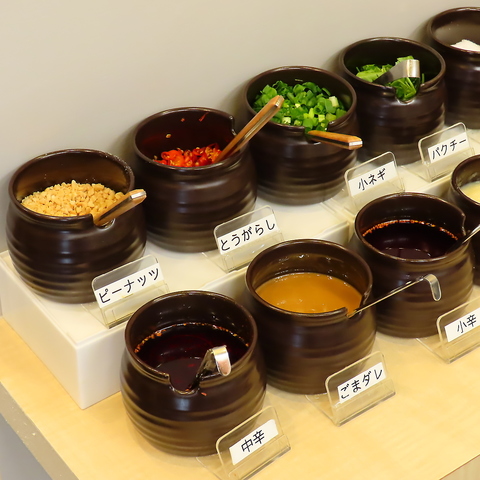 麻辣湯を最後まで最高の状態で楽しんでいただくため、当店では多彩な調味料・薬味をセルフサービスでご提供しています。ニンニク、ピーナッツ、パクチー、特製ダレ、黒酢など、豊富に取り揃えられた調味料の中から、お客様ご自身でお好きなものをお好きなだけ小鉢に取って、味の濃さや辛さ、風味を調整していただけます。