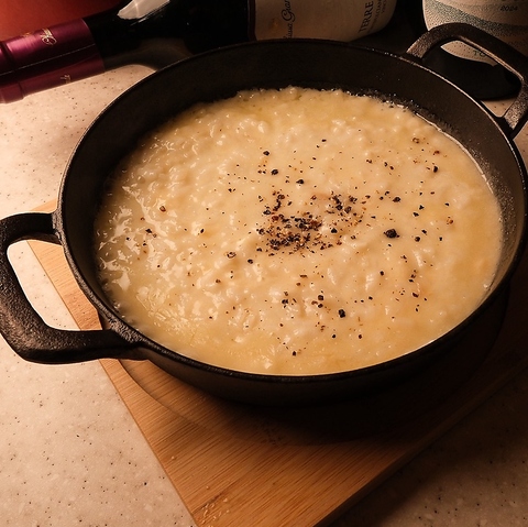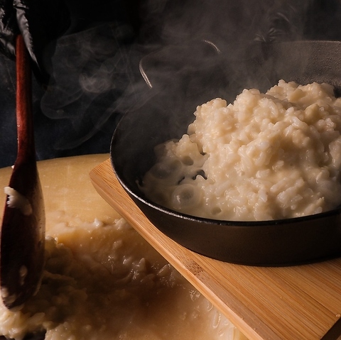 繊細な鶏のブロード(出汁)で炊き上げ、あくまで濃厚、まるでチーズそのものを食している様なイメージ!アツアツの鉄鍋での提供です。