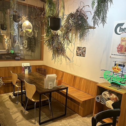 観葉植物に囲まれた店内は、お洒落モダンな空間と落ち着いた照明が心地よい安らぎをを演出します。また自然とモダンが調和した上質な空間で楽しむお食事やお酒は、特別な時間をお過ごしできることでしょう。心ほどける時間をご提供いたします。