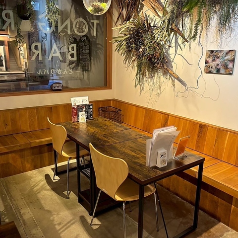 明るい木目のテーブル席が中心のお席で、席の間に余裕がございますので気にせず会話に集中できます。観葉植物に囲まれたお洒落モダン空間を基調に、動線を意識した配置で出入りしやすい設え。木目調×コンクリートの意匠は会話が弾み、柔らかな照明が長居を誘い、完全禁煙でとっても清潔☆家族連れの方も快適に過ごせます!