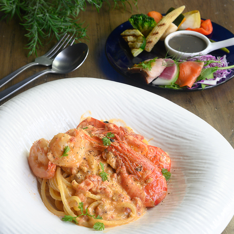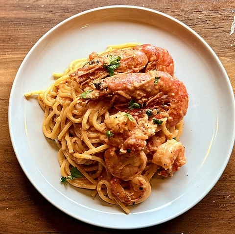 椎茸の出汁を使ったトマトソースは、旨味が豊かで深い味わいが特徴。プリプリ食感の有頭海老を贅沢に使い、チーズがたっぷりの濃厚なクリームソースでまとめられたお店自慢の一皿◎