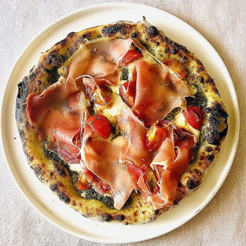 生ハムの塩味とデミ玉がアクセント!トマトソースとの相性も抜群♪とろーりとした卵黄が絡むことで、クリーミーさが加わり、全体のバランスを整えます。それぞれの特徴が楽しいピザ◎