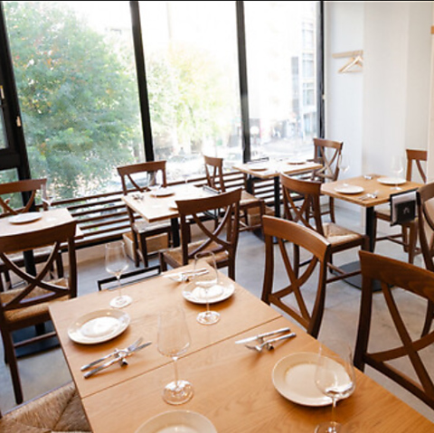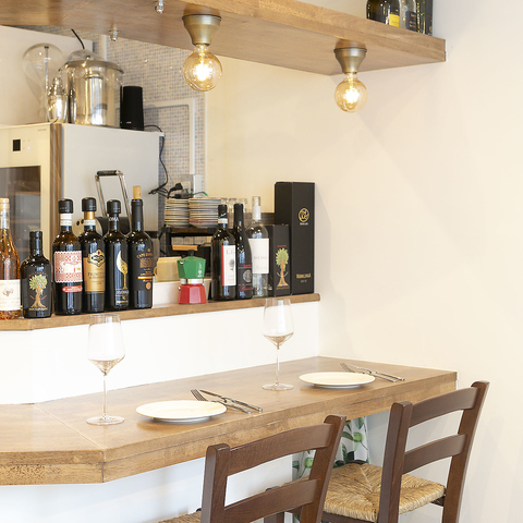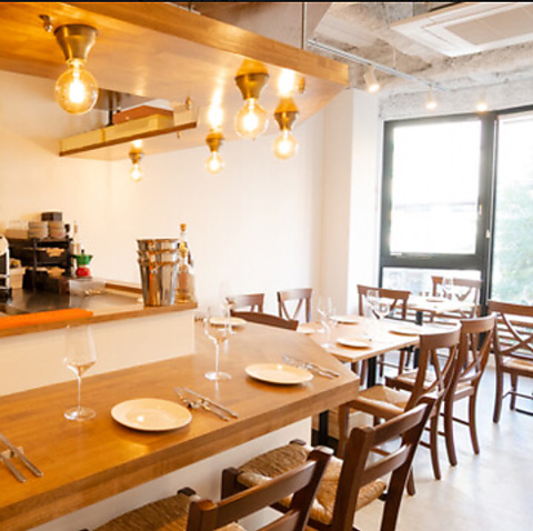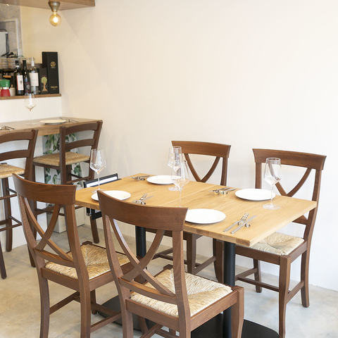 木の温もりを感じる落ち着いた店内。カウンター席で気軽にワインを楽しむも良し、テーブル席でゆったり食事を楽しむも良し。明るく洗練された空間で、特別なひとときをお過ごしください。デートのご利用や少人数でのご利用に最適です◎