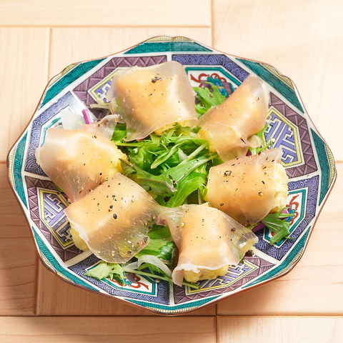 一度食べたら忘れられない!創作和食の粋を集めた「マンゴーと生ハムの白和え」。濃厚なマンゴーの甘味、生ハムの芳醇な塩気、そしてなめらかな白和え衣のバランスが絶妙。日本酒にもワインにも合う、大人のための極上おつまみです。この驚きの組み合わせをぜひご賞味ください。