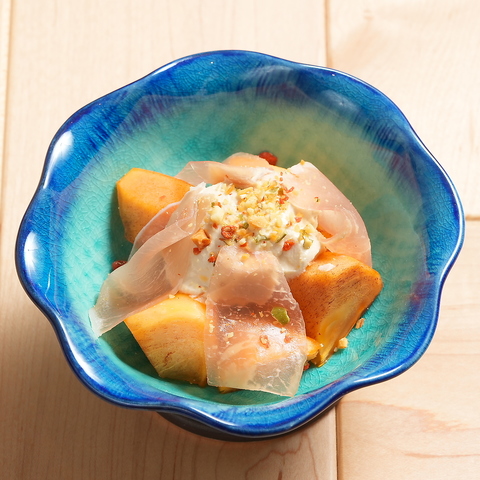 一度食べたら忘れられない!創作和食の粋を集めた「マンゴーと生ハムの白和え」。濃厚なマンゴーの甘味、生ハムの芳醇な塩気、そしてなめらかな白和え衣のバランスが絶妙。日本酒にもワインにも合う、大人のための極上おつまみです。この驚きの組み合わせをぜひご賞味ください。