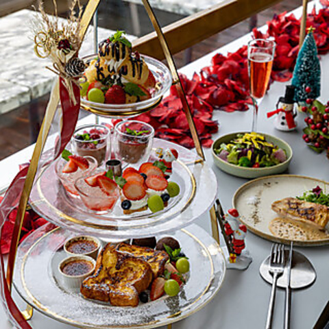 イチゴをテーマにしたクリスマスアフタヌーンデザート ランチセット☆前菜とメインディッシュに加え、いちごのプロフィトロール、ベリーのチョコパンナコッタ、カスタードと生クリームのいちごパイ等、7種類の豪華なデザートを楽しめます。90分間のフリーフローが付いており、優雅で充実したランチタイムを過ごせます。ぜひご利用ください★