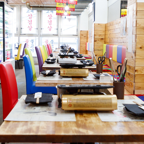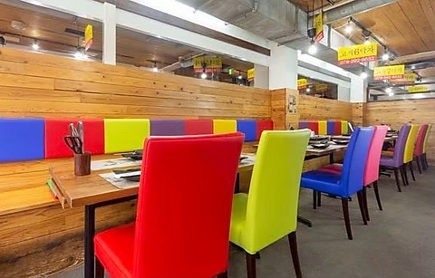 韓国の食堂をイメージした店内は、カラフルなチェアやクッションが目を惹く“映える”デザインが魅力です♪ 木目調のテーブルと椅子で統一された空間は、明るいながらも落ち着いた雰囲気◎女子会やデート、ご家族でのお食事など、幅広いシーンでご利用ください。