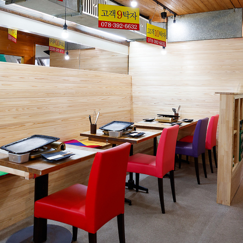 韓国の食堂をイメージした明るいメインフロアのテーブル席は、2名様からのご利用に最適です。木目調のテーブルにカラフルなチェアが並び、賑やかな雰囲気◎デートや女子会を盛り上げること間違いなし!