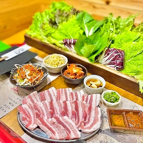 自慢のサムギョプサルは、国産の豚肉と新鮮な野菜を使用しています。カリッと焼いた豚肉に、お好みの具材と自家製味噌を乗せ、葉っぱで包んでお召し上がりください!チーズフォンデュなどの追加トッピングもご用意。キムチや包み野菜などが付いた90分食べ放題コース4500円(税込)もあります♪