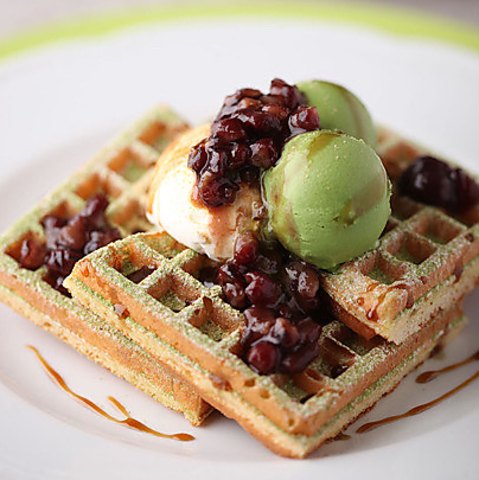 抹茶アイスとあずきの甘さ、黒蜜ときなこの風味が上品な味わいを演出する和風ワッフルです。