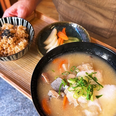 具だくさんの粕汁と栄養豊富な玄米で、体に優しくほっと温まる和の朝食。お好みのトッピングで自分流に◎