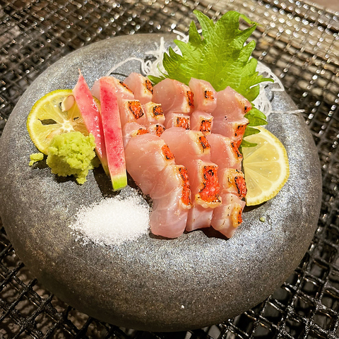 香り豊かな逸品!旬の鰆や鰹を贅沢に!特製にんにく塩で味わう【本日の鮮魚で藁焼き】