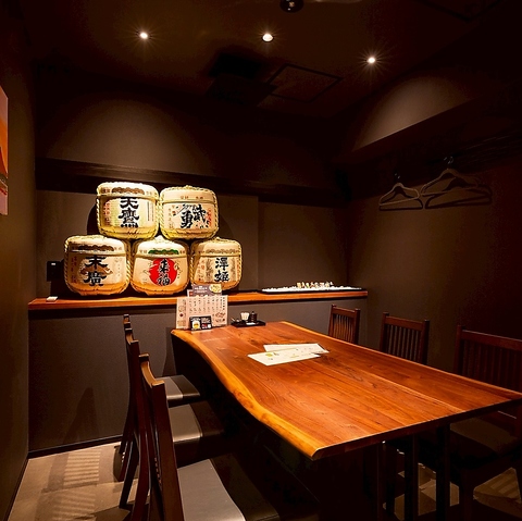 照明を落としたシックで落ち着いた雰囲気の店内には、周りを気にせず過ごせる完全個室を完備しています。都会の喧騒を忘れさせてくれる隠れ家のような空間は、大切な記念日やデート、ビジネスシーンにも最適です◎プライベートが守られた上質な空間で、自慢の炉端焼きを囲みながらゆったりとした時間をお楽しみください。