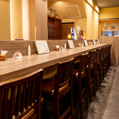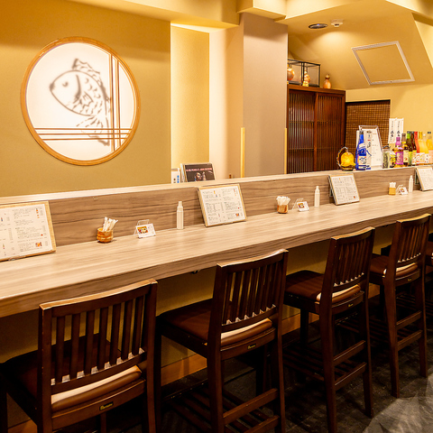 カウンター席は、お一人様でも気兼ねなくご利用いただける特等席です◎目の前で職人が調理する様子を眺められるライブ感も魅力の一つ♪出来立ての「鯛めし丼」や、厳選された日本酒と相性の良い一品料理を、落ち着いた和の空間でゆっくりとご堪能ください。お食事に集中できる居心地の良さも自慢です。
