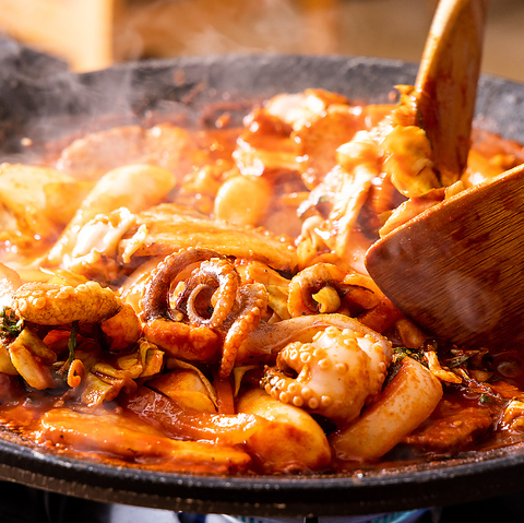 韓国ホンデで若者に人気の「チュクミ(=イイダコ)」、旨味もたっぷりの辛いタレと絡めたソースは、〆のとびこチャーハンで2度お楽しみいただけます◎