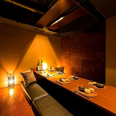 店内は落ち着いた和の雰囲気が漂い、扉付きの完全個室を中心に構成されています。周りの声が気にならないため、会食やデート、ゆっくり語りたい飲み会まで、幅広いシーンで安心して利用できるつくりです。照明はほどよく柔らかく、食事を邪魔しない落ち着いた明るさに調整。