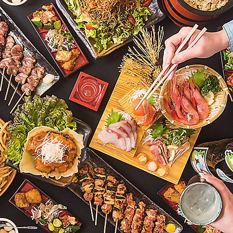 串焼きや馬刺し、地鶏の炭火焼き、サクサクの揚げ物など、絶品料理を種類豊富にご用意♪