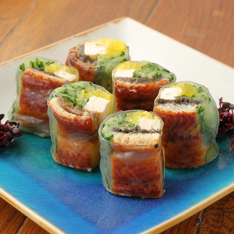 たくあん、もみきゅうりと一緒に生春巻きで巻きました!うなぎの旨味とたくあんの甘味、クリーミーなチーズが相性抜群です♪ぜひ一度ご賞味ください!すべてのお料理に化学調味料不使用で、初めての方でも“食べたい一品”に必ず出会えるお店です。