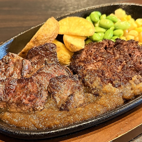 迷った方や初めての方にもおススメ◎ハンバーグとステーキがどっちも楽しめるお得なコンボメニューです!※ステーキの焼き加減はミディアムでお出ししています。暑い鉄板でお出しするため熱が入るとお肉が硬くなる場合がございますため、お早めにお召し上がりください。