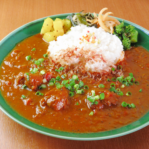 鰹出汁をベースに、数種のスパイスと豚ひき肉をじっくり煮込んだ、旨みとコクが広がるポークキーマカレー。和の出汁のやさしさとスパイスの香りが絶妙に調和し、濃厚ながらも食べやすい仕上がりに。ランチやしっかり食べたい日の食事におすすめです。ドリンクセット+1500円(税込)