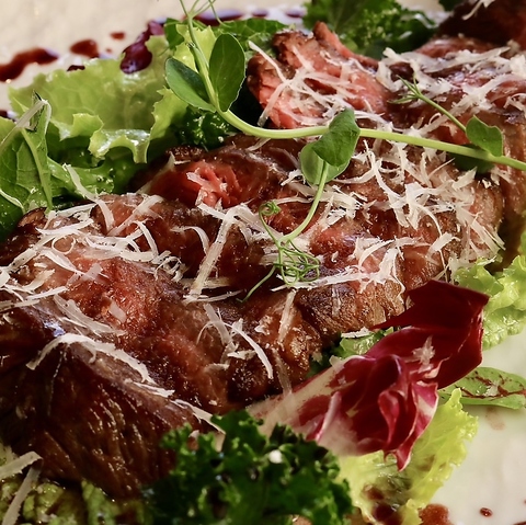 国産牛の赤身を使った菜園風ステーキや牛カツ、ほろとろの蜜焼きスペアリブなど。お酒に合うお料理も多数。