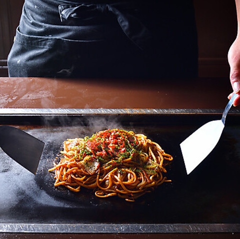 スタッフが目の前で熟練のヘラさばきで焼き上げるライブ感もどてっぱんの魅力。はがしを片手に具材が焼けるジュージューという音と、食欲をそそる香りをお楽しみください。