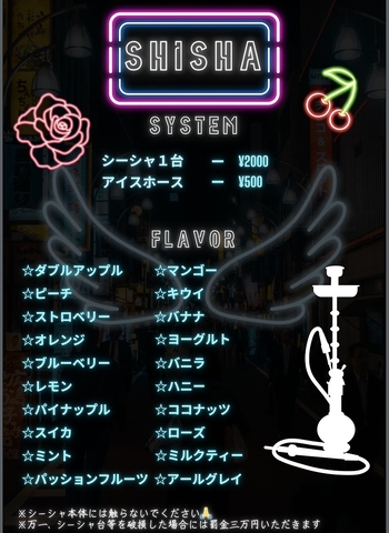 シーシャ1台2,000円~フレーバー多数ご用意!