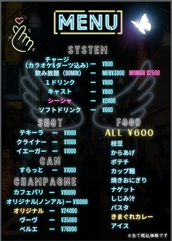 | 営業時間 | 月~日、祝日、祝前日: 21:00~翌5:00 (料理L.O. 翌4:30 ドリンクL.O. 翌4:30) |