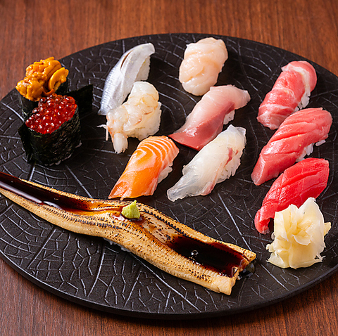 大トロ・中トロ・赤身・真鯛・ホタテ・ぶり・特大煮穴子・生エビ・自家製〆鯖・サーモン・イクラ・ウニ など(※画像はイメージです。)