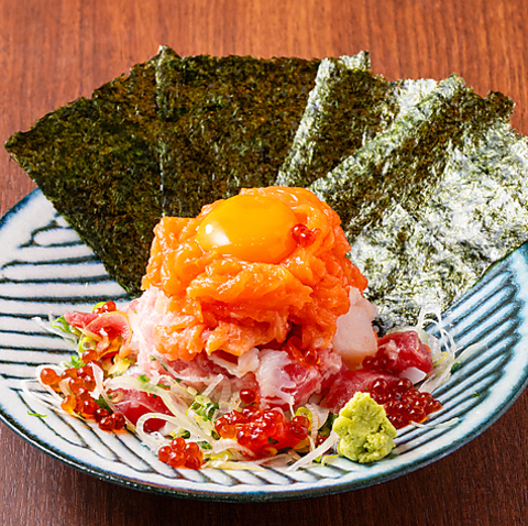 その日に仕入れた新鮮ネタをたっぷり盛り込んだ、当店のイチオシ海鮮丼!「まぐろ」や「サーモン」、「ぶり」や「いくら」など、日毎に厳選した旬の魚介を贅沢に使用♪ランチタイム・ディナータイム共にご提供いたしております◎(内容は日替わりになりますので詳細は店舗スタッフまでお尋ねください。)